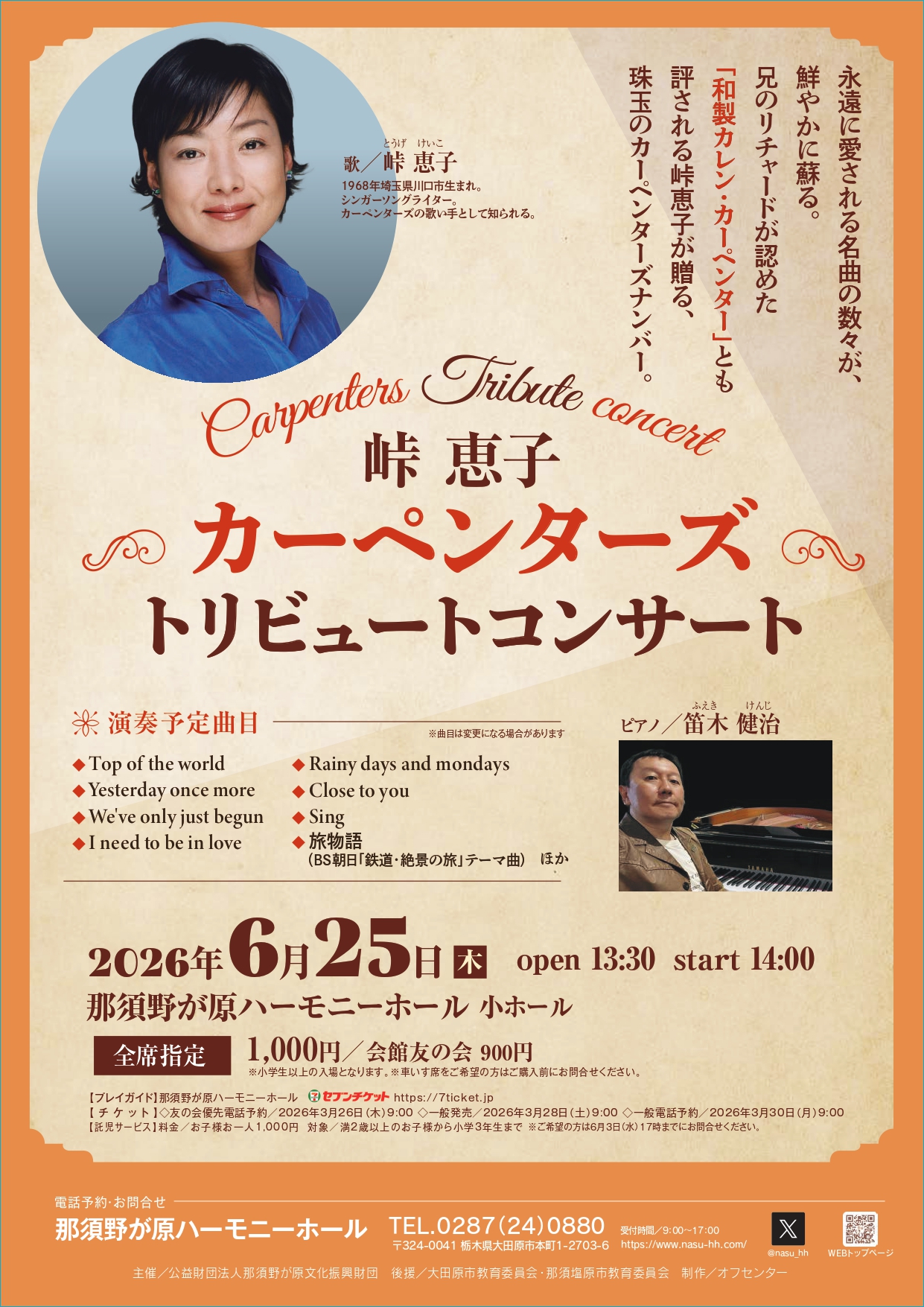 カーペンターズの名曲がよみがえる! 「カーペンターズの歌い手」「和製カレン・カーペンター」と評される峠恵子が初来館。落ち着いたひと時をどうぞ。